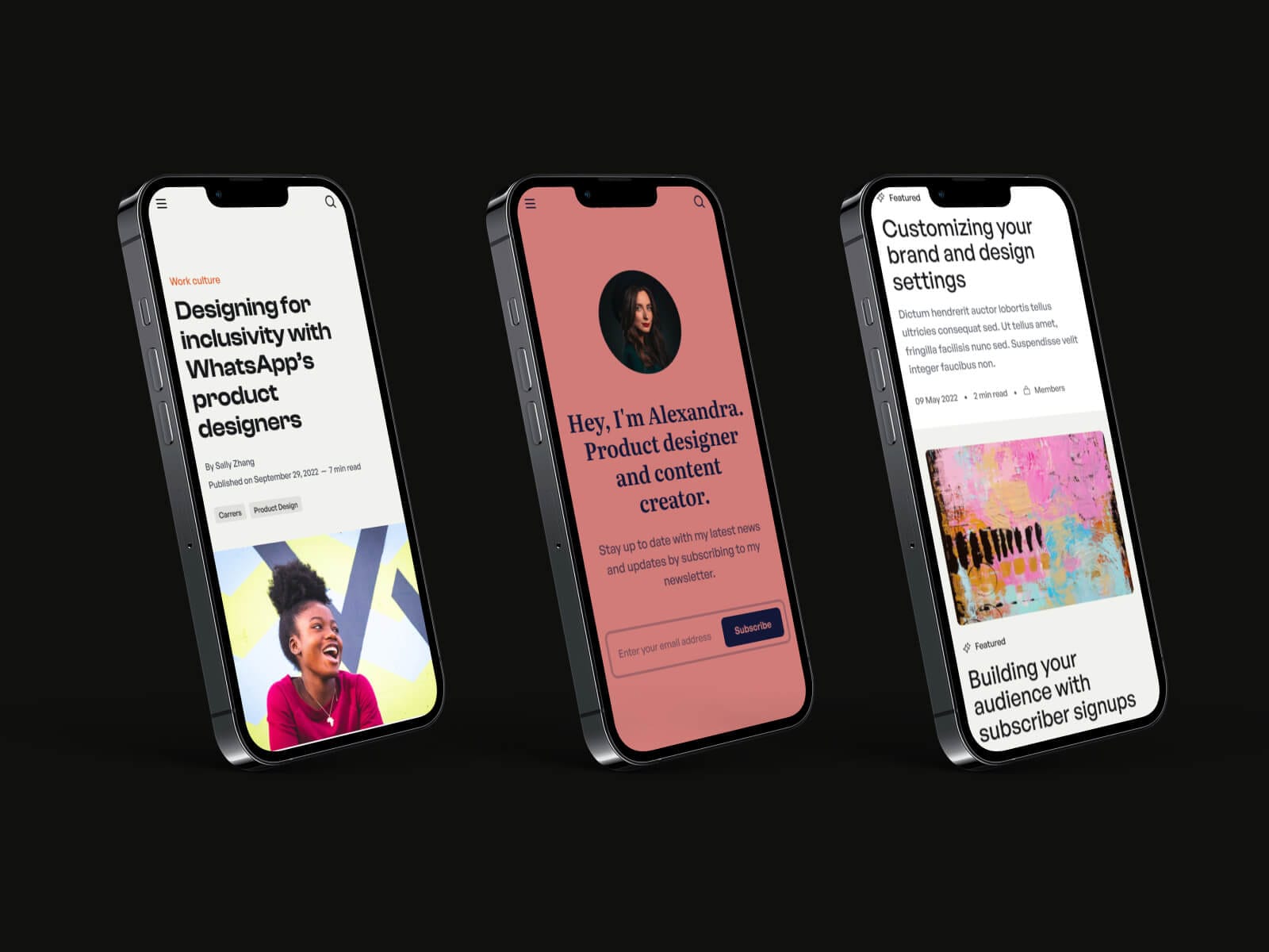 Offer your readers the possibility to enjoy your content in both light and dark mode, and customize the theme colors according to your preferences and brand.